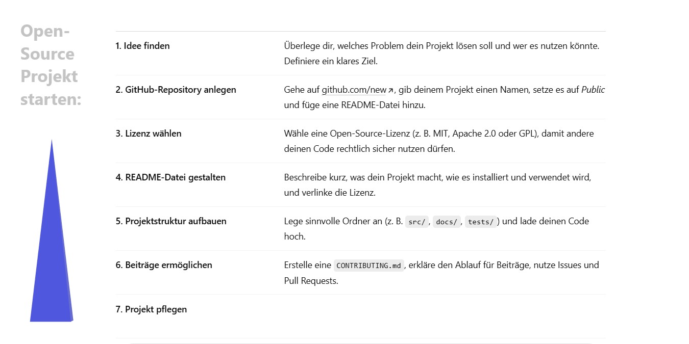 Wenn du eine Idee hast, kannst du auf github.com kostenlos ein neues Repository anlegen. Das Repository ist der Ort, an dem dein Code, deine Dokumentation und alle Dateien des Projekts liegen. Gib deinem Projekt einen aussagekräftigen Namen, setze es auf „Public“ und füge gleich eine README-Datei hinzu – sie ist die Visitenkarte deines Projekts. In der README erklärst du kurz, worum es geht, wie man das Projekt installiert und verwendet, und unter welcher Lizenz es steht. Da sich vielleicht viele für dein Projekt interessieren und technisch nicht so fit sind, ist es ratsam vielleicht zusätzlich ein kleines Youtube-Tutorial dazu zu machen, falls die Installation schon sehr schwierig ist. 5 Minuten- Kurz-Tutorial